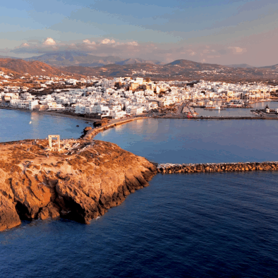 As the capital and main port of the island, Naxos Town, also known as Chora, is the vibrant heart of the island. Its old town is a maze of whitewashed alleys, medieval architecture, and hidden courtyards. Climb up to the Venetian Castle (Kastro) for panoramic views, then stroll down to the waterfront and watch the sunset behind the iconic Portara, the massive marble gate of an unfinished ancient temple.