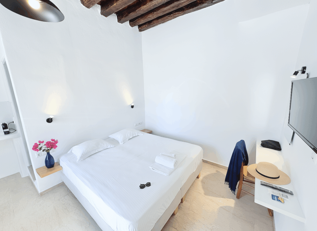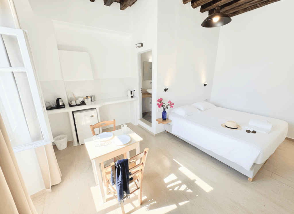 Designed with flexibility in mind, this studio is perfect whether you are traveling as a couple or two friends, as it can be configured with either a comfortable double bed or two separate single (twin) beds. An additional single bed can be added upon request. The room is fully equipped with an en-suite bathroom, air conditioning, free high-speed Wi-Fi, and a flat-screen TV with streaming access. You also have a functional kitchenette with a mini-fridge and coffee-making facilities, providing a relaxed and independent feel for your island vacation. Situated in a prime spot in Naxos Chora, this studio puts the entire town at your fingertips. You are just steps away from the bustling main street, the Old Town's narrow cobblestone alleys, and the main transportation links. Enjoy the freedom of exploring the historic Castle and nearby beaches, knowing you have a comfortable and quiet retreat waiting for you moments away.