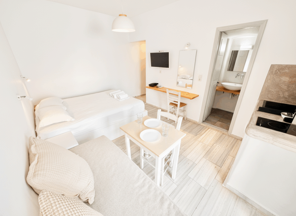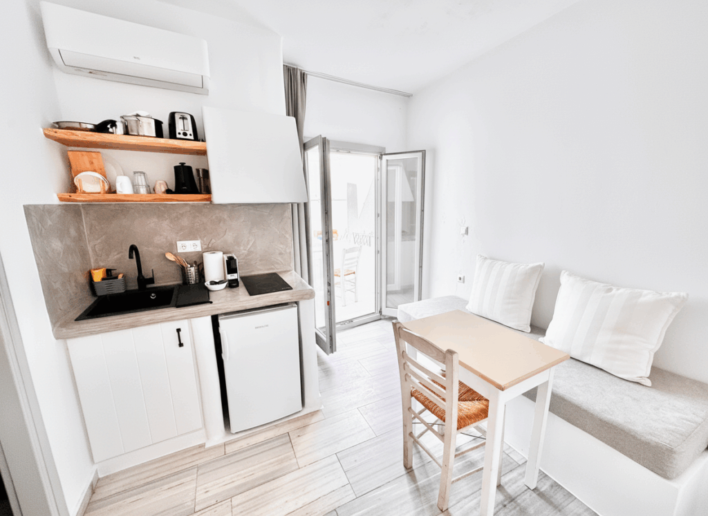 Ideal for two, this spacious studio offers a bright and comfortable stay. It features a plush double bed, a private modern bathroom, and all standard amenities including A/C, free Wi-Fi, and a Smart TV. The kitchenette is full-featured (cooktop, fridge, coffee machine). Your small private terrace is a lovely spot to step out, relax, and enjoy a drink after a day of island hopping.